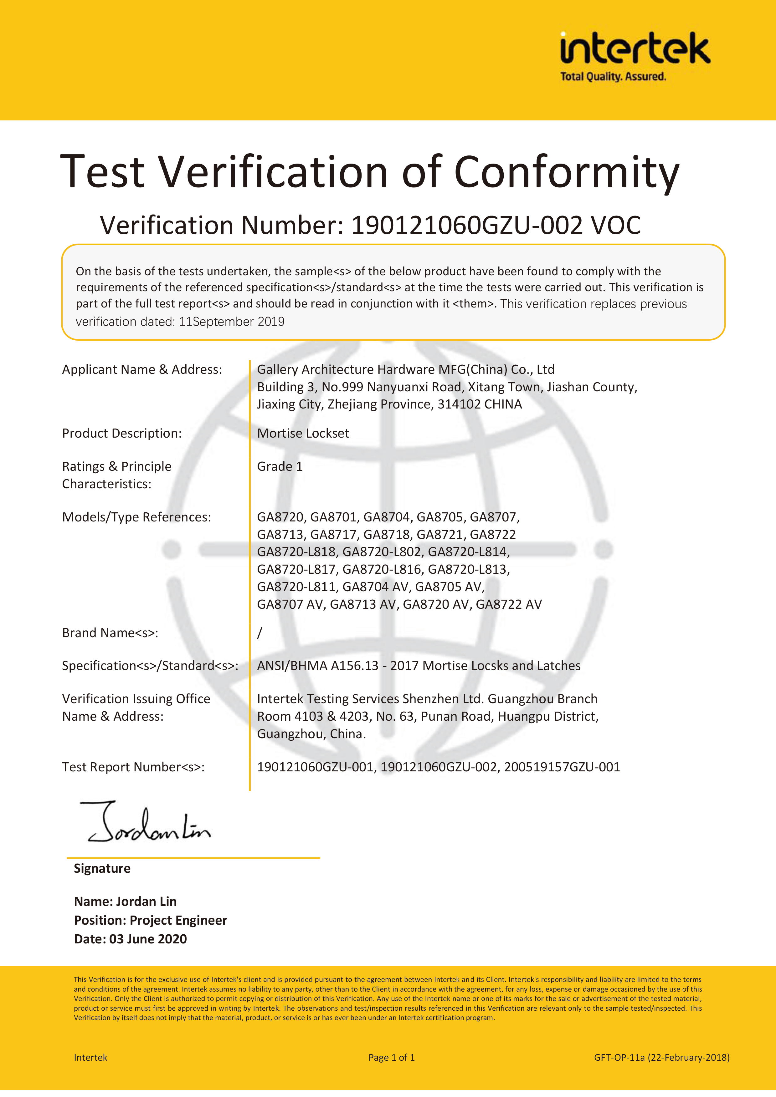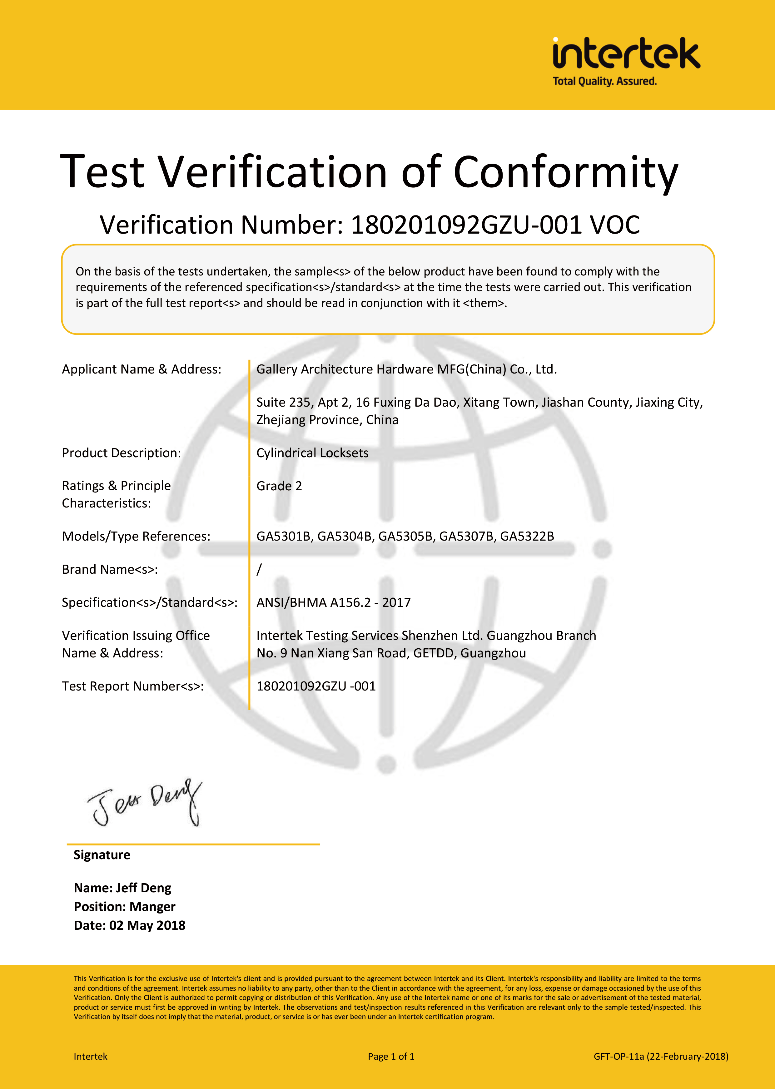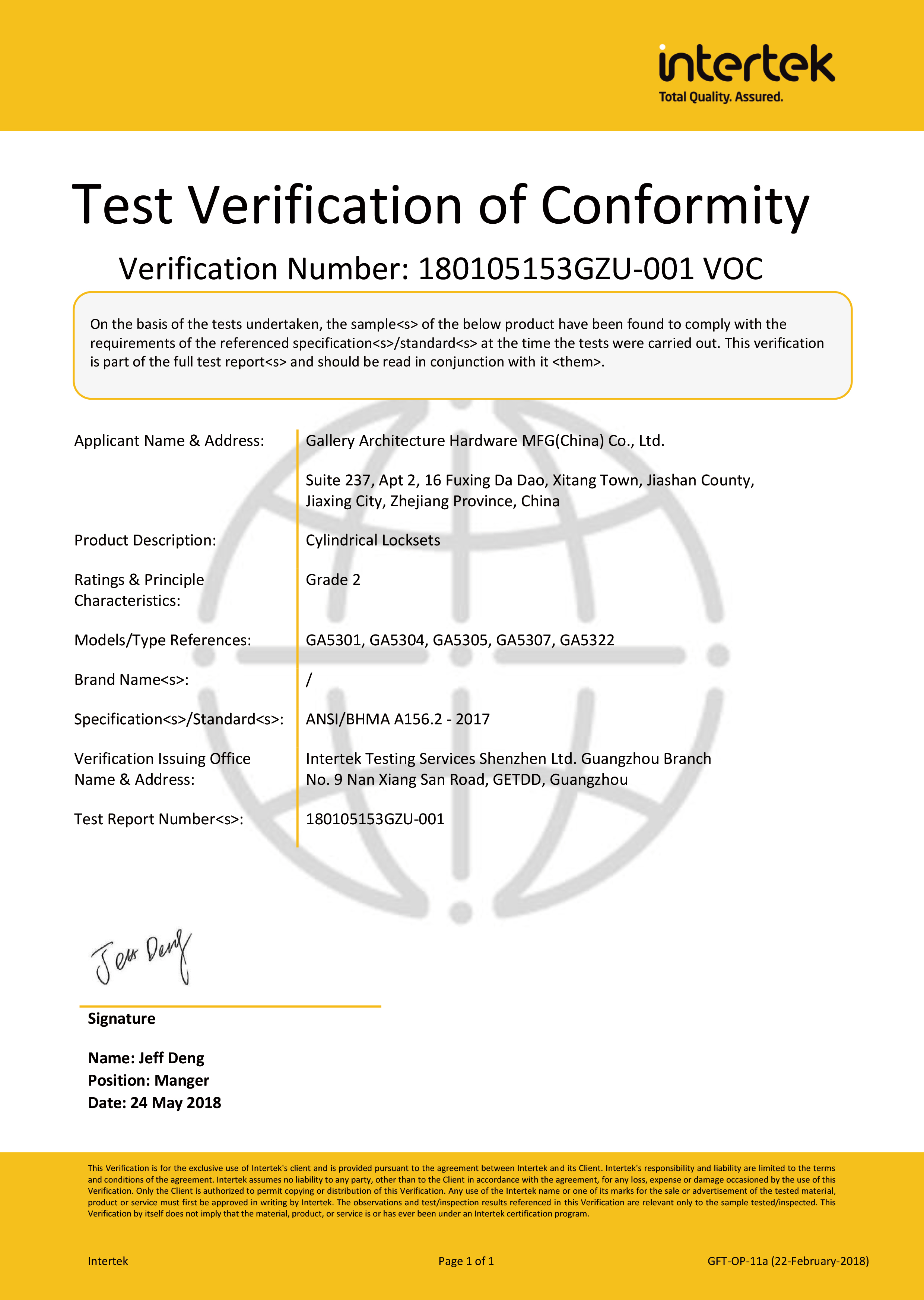 浙江堅迪五金制造有限公司始建于 1995 年。自 2003 開始,公司致力于高標準商業鎖的研發(fā)工作,并于 2006 及 2007 年,8700 插芯鎖系列獲得美國國家標準 ANSI A 156.13-2005 一級、ANSI A 156.2-2003 二級和美國 UL 10C3 小時防火測試認證。自 1998 年以來,公司不斷提升產品和客戶服務品質,并獲得了 ISO 9001 的認證。